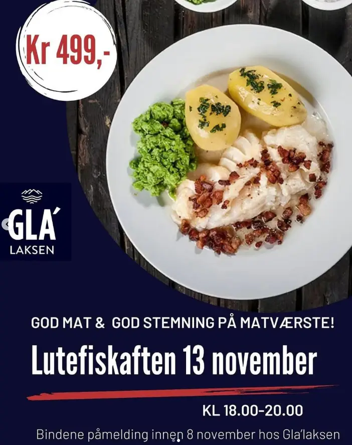 Dette gleder vi oss til; lutefiskaften i mathallen! Torsdag 13. november kl. 18:00 inviterer Gla’laksen til en tradisjonsrik kveld med klassisk lutefisk og alt som hører til!🤍 Kun 30 plasser – påmelding innen 8. november. Pris: 499,- per person. Reservasjon og betaling hos Gla’laksen.